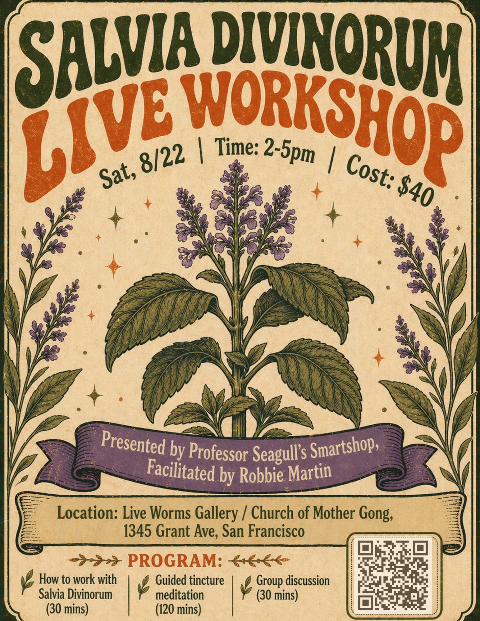 Join Professor Seagull's Smartshop and Robbie Martin (co-host of Media Roots Radio podcast) for a Salvia Divinorum workshop. Participants will learn how to work with Salvia Divinorum, then there will be a meditation, followed by discussion time.